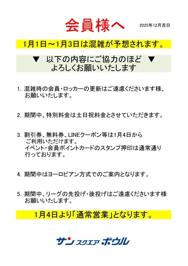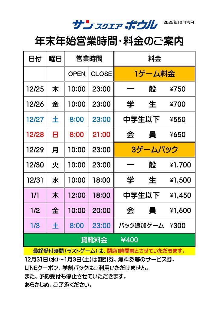 年末年始営業時間・料金のご案内🐍🐎 サンスクエアボウル ご案内 トピック ボウリング URLをコピーしました! ICカード入金限度額変更のお知らせ 【サンスクエアスタジアム】年末年始営業時間のご案内🎍 関連記事 【サンスクエアボウル】開運!年末年始 冬の運試し開催!⛄ 2025年12月2日 【サンスクエアボウル】混雑・貸切案内🕑 2025年11月28日 【サンスクエアボウル】冬休みボウリング大会🎳 2025年11月24日 【サンスクエアボウル】学校団体予約受付中!🏫 2025年11月4日 【サンスクエアボウル】会員ロッカー更新の案内 2025年11月4日 【サンスクエアボウル】ボウリング×141 OUJI TABLE 予約プラン🎳🍴 2025年11月1日 【サンスクエアボウル】ボウリングゲーム価格改定のお知らせ 2025年10月1日 【サンスクエアボウル】大会・レッスンのご案内🎳 2025年9月29日
