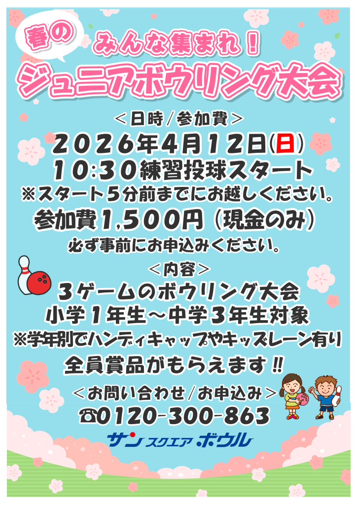 【サンスクエアボウル】春のジュニアボウリング大会 4/12(日)開催🌸