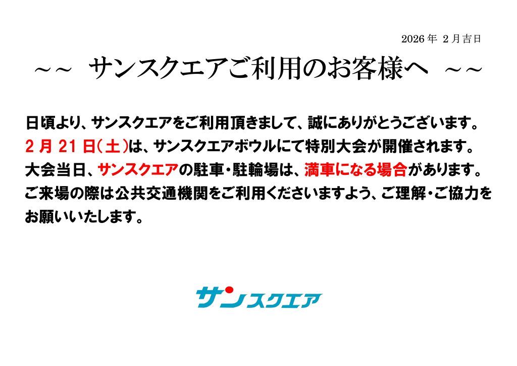 混雑・貸切案内🕑 サンスクエアボウル 混雑案内 ボウリング URLをコピーしました! 2月大会/練習会の予定 お知らせ!! 関連記事 【サンスクエアボウル】ゾロ目チャレンジ開催! 2025年12月2日 【サンスクエアボウル】学校団体予約受付中!🏫 2025年11月4日 【サンスクエアボウル】会員ロッカー更新の案内 2025年11月4日 【サンスクエアボウル】ボウリング×141 OUJI TABLE 予約プラン🎳🍴 2025年11月1日 【サンスクエアボウル】ボウリングゲーム価格改定のお知らせ 2025年10月1日 【サンスクエアボウル】大会・レッスンのご案内🎳 2025年9月29日 【サンスクエアボウル】平日のみ 学生限定学割パック🏫 2025年2月1日 【サンスクエアボウル】予約イベント「始球式ストライクチャレンジ」開催‼ 2024年11月10日