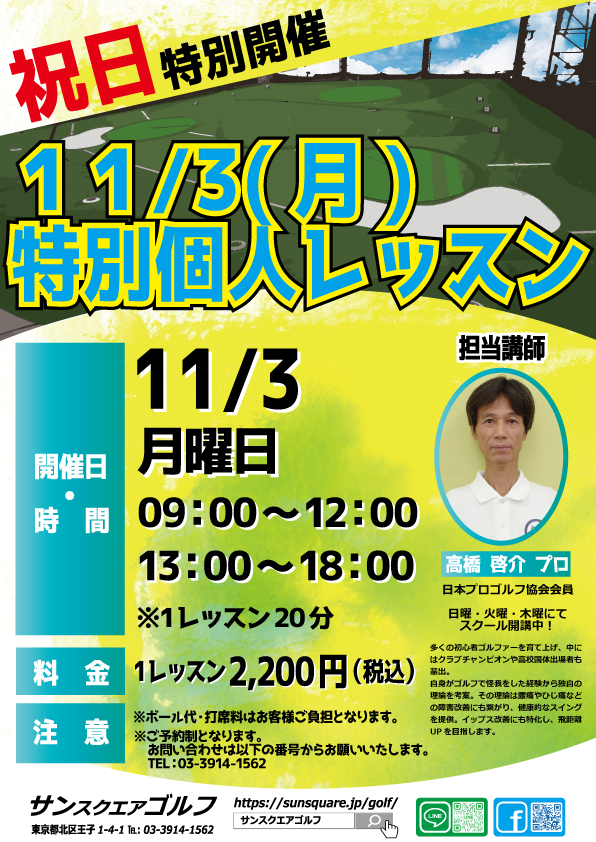 複数名で利用される場合は、人数分のレッスン数をご予約ください。 - ボール代及び打席料はお客様ご負担となります。