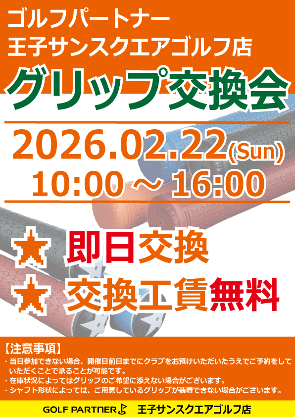 開催日時 2026年2月22日(日曜日)10:00 ~ 16:00 開催場所 サンスクエアゴルフ練習場40番・41番打席 特 典 即日交換可能! 交換工賃無料 注意事項 当日参加できない方は、ご予約でクラブを預かり交換を承ります。 在庫状況によってはグリップのご希望に添えない場合がございます。 シャフト形状によっては、ご用意しているグリップが装着できない場合がございます。 ゴルフパートナー URLをコピーしました! 【2026/2/23】特別個人レッスン! 関連記事 【お買い得!】XXIO13マークダウン 2025年12月16日 店内配置変更のお知らせ 2025年10月12日 XXIO13マークダウンキャンペーン 2025年9月1日 【サンスクエアゴルフ】アルバイトスタッフ募集 2025年4月1日 ゴルフパートナーポイントアプリをご利用のお客様へ 2024年3月6日 動画撮影について禁止事項 2023年5月26日 団体利用に関して 2022年5月9日