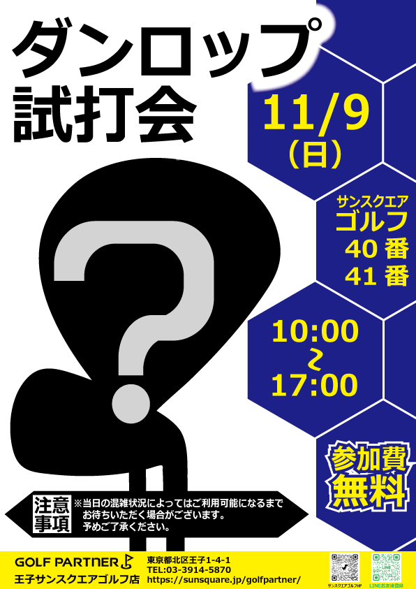 開催日 2025年11月9日(日) 開催場所 サンスクエアゴルフ練習場 40番・41番打席 開催時間 10:00 ~ 17:00 参加費 無料 注意事項 当日の混雑状況によっては、ご利用できるまでお待ちいただく場合がございます。予めご了承ください。 ゴルフパートナー URLをコピーしました! 🍂秋限定商品のご紹介🍂 関連記事 【第二弾】XXIO13マークダウンキャンペーン 2025年10月24日 【緊急】買取20%UP査定会【開催】 2025年10月17日 店内配置変更のお知らせ 2025年10月12日 XXIO13マークダウンキャンペーン 2025年9月1日 オータムセール!! 2025年9月1日 夏季におけるゴルフスクール熱中症対策について 2025年6月28日 【サンスクエアゴルフ】アルバイトスタッフ募集 2025年4月1日 ゴルフパートナーポイントアプリをご利用のお客様へ 2024年3月6日