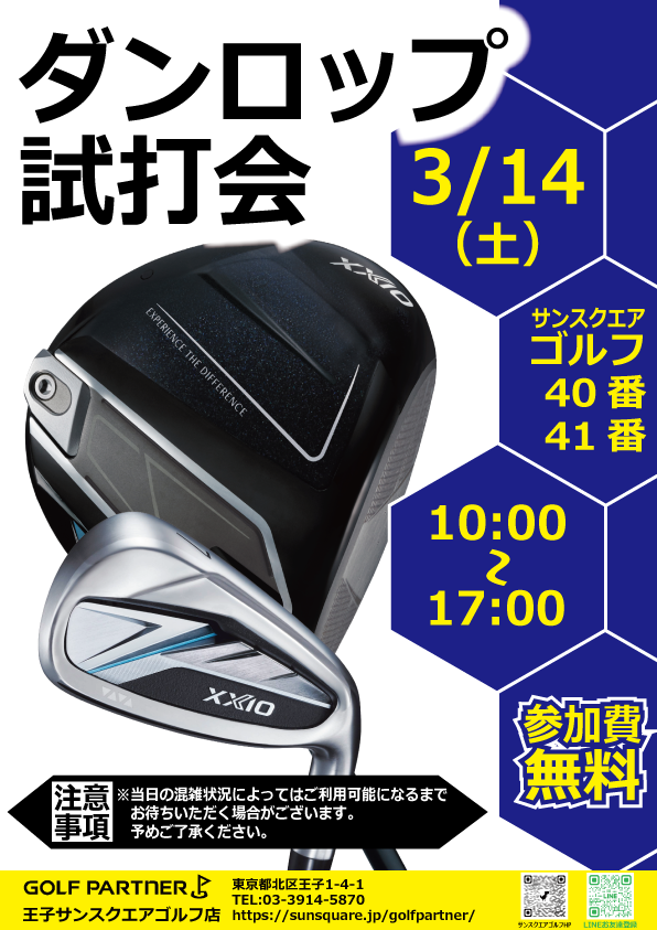 開催日 2026年3月14日(土) 開催場所 サンスクエアゴルフ練習場 40番・41番打席 開催時間 10:00 ~ 17:00 参加費 無料 ご参加希望の方は、当日そのまま40番・41番打席へお伺いください。 注意事項 当日の混雑状況によっては、ご利用できるまでお待ちいただく場合がございます。予めご了承ください。 ゴルフパートナー URLをコピーしました! ICカード入金機について 【サンスクエアボウル】2/23(月祝)混雑のご案内 関連記事 【お買い得!】XXIO13マークダウン 2025年12月16日 店内配置変更のお知らせ 2025年10月12日 XXIO13マークダウンキャンペーン 2025年9月1日 【サンスクエアゴルフ】アルバイトスタッフ募集 2025年4月1日 ゴルフパートナーポイントアプリをご利用のお客様へ 2024年3月6日 動画撮影について禁止事項 2023年5月26日 団体利用に関して 2022年5月9日